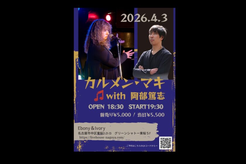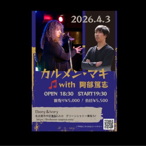 カルメン・マキ with 阿部篤志 4月 3 Fri 2026 EventPopsRock/BluesSpecialEvent Vo.カルメン・マキ Pf.阿部篤志 Open18:30 Start19:30 MC5000円(予約)5500円(当日) TC500円 前のスケジュール
