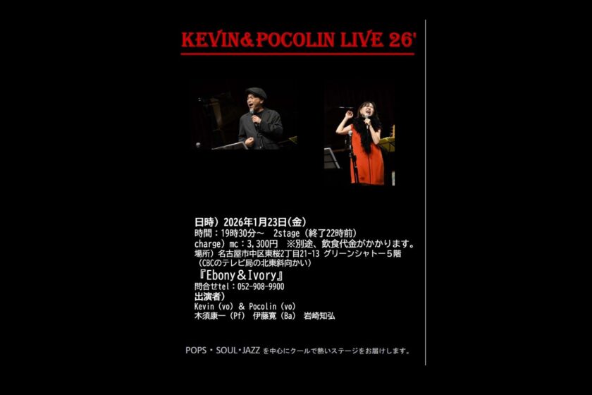 ケビン&ポコリン 新春ライブ 1月 23 Fri 2026 event Vo.Kevin Vo.Pocolin Pf.木須康一 Ba.伊藤寛 Dr.岩崎知弘 Start19:30 MC3300円 前のスケジュール 次のスケジュール