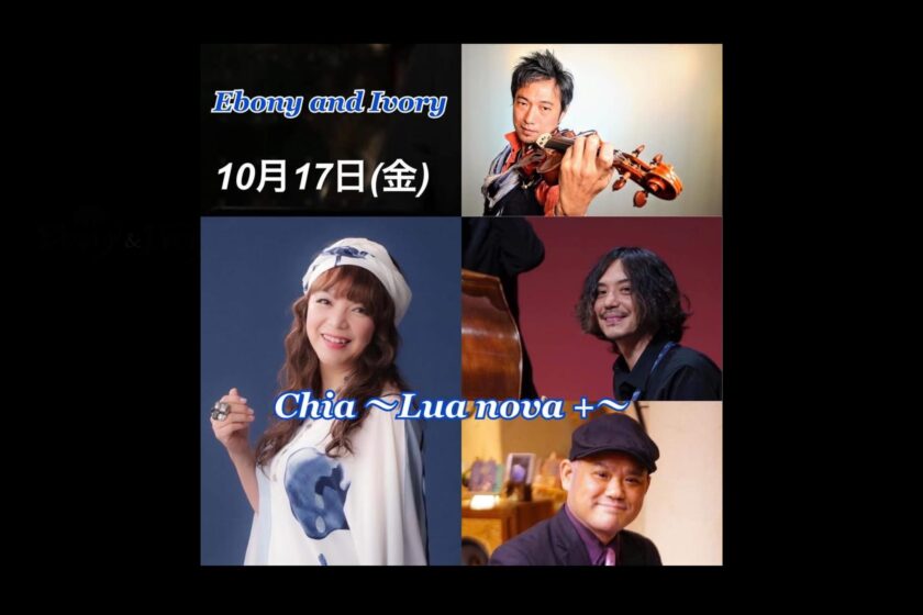 Chia~Lua Nova~ 10月 17 Fri 2025 JazzSpecialEvent Vo.Chia Vn.高橋誠 Gt.砂掛康浩 Pf.Tito Monte Open18:30 Start19:30 MC3500円 TC500円 前のスケジュール 次のスケジュール