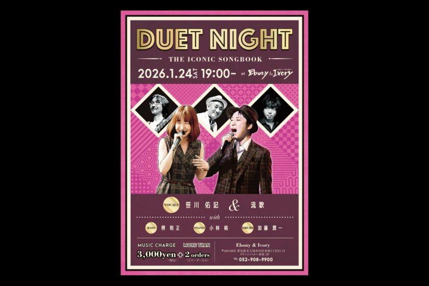 DUET NIGHT 1月 24 Sat 2026 event Vo.笹川佑記 Vo.流歌 Pf.小林格 Ba.堺則正 Dr.河原弘 Start19:00 MC3000円 前のスケジュール 次のスケジュール