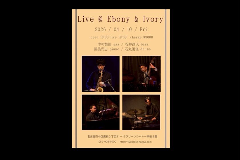 Jazz Live 4月 10 Fri 2026 Event Sax.中村智由 Pf.渥美尚志 Ba.谷井直人 Dr.石丸柔瑳 Open18:00 Start.19:30 MC3000円 TC500円 前のスケジュール 次のスケジュール